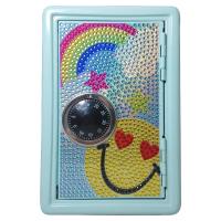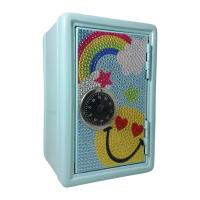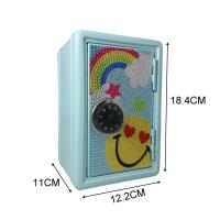 1.外觀是以粉體烤漆完成2.產品上方有一投幣孔3.含有旋轉功能之數字鎖4.水鑽貼紙設計5.材質: 鐵板6.尺寸:12.2*11*18.4(高)公分7.包裝:每個入塑膠袋後再入彩盒8.材積: 24個/箱,2.8', 淨重:14.4公斤,毛重:15.6公斤